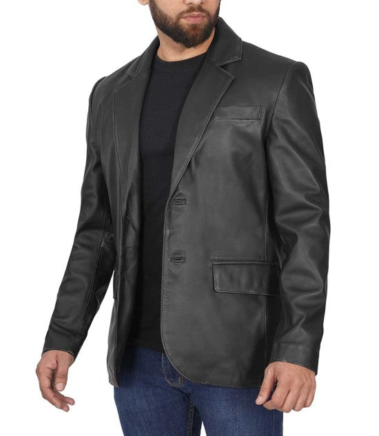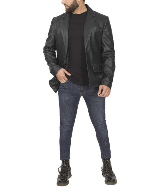 Crafted from genuine black leather, this mens leather blazer jacket has a timeless look that will never go out of style. The classic design features a notched lapel collar and a two-button front closure, making it the perfect choice for any occasion.