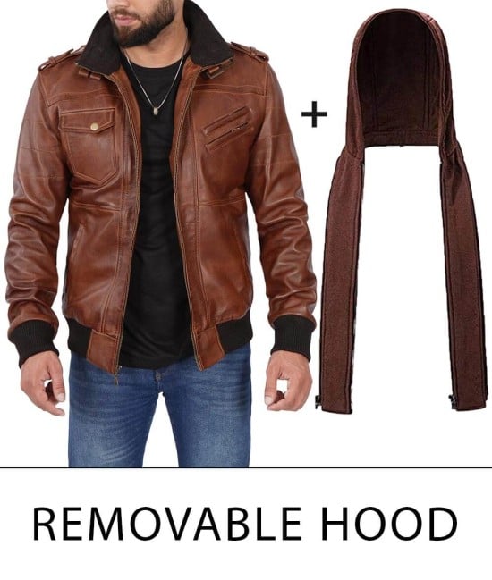 Brown Leather Bomber Jacket for Men with Removable Hood
