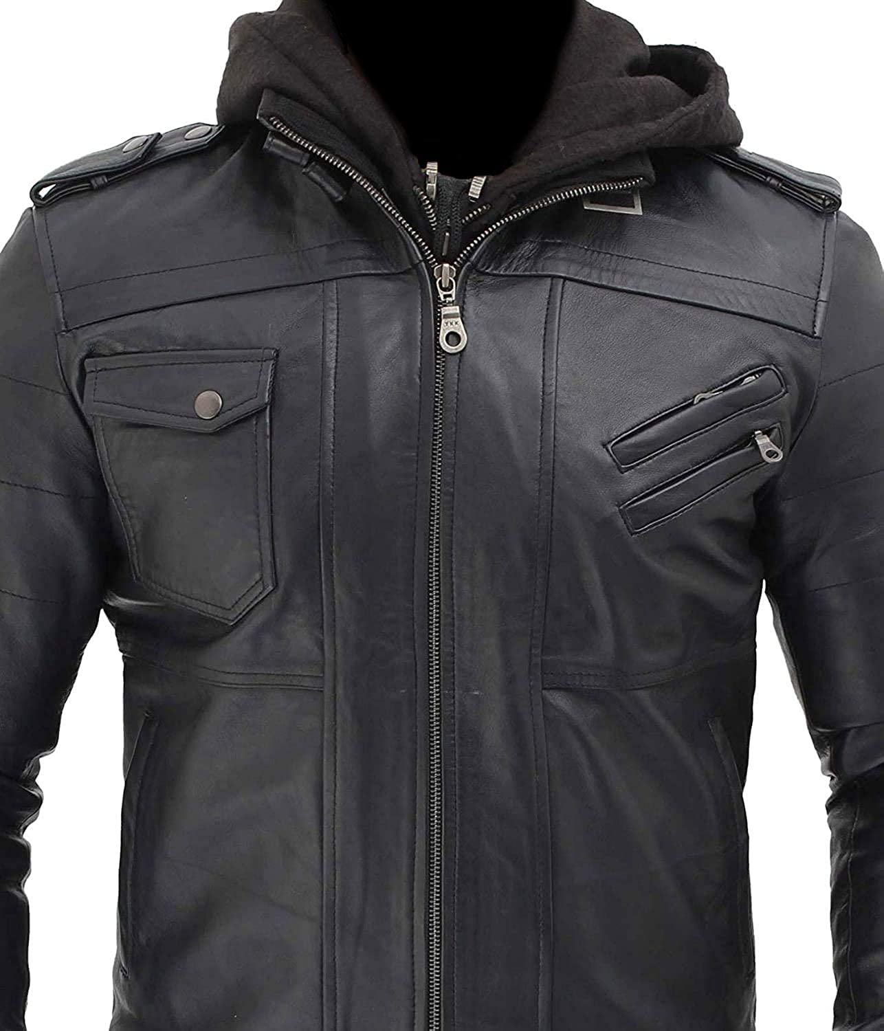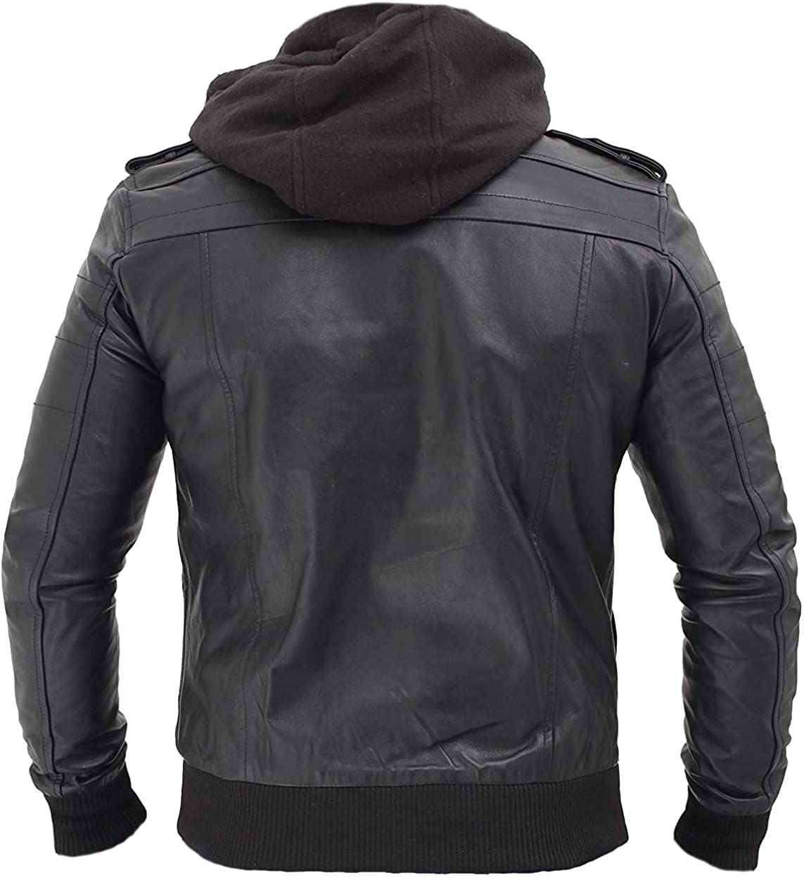 • This bomber leather jacket has a standup collar with double strap button closure, shoulder epaulets for style, and a removable hood to cover the head when needed.