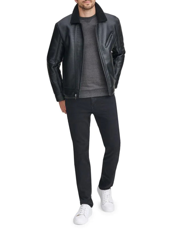 A handsome biker style jacket made of full grain lambskin leather topped with a contrast faux-shearling collar.