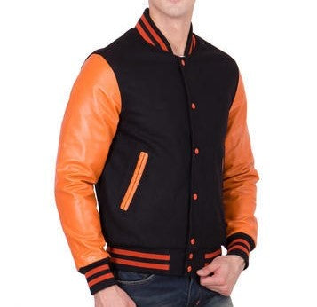 The exterior of a mens leather varsity jacket is typically made of high-quality leather, which gives it a durable, rugged look. The leather is often thick and heavy, providing warmth and protection from the elements. The front of the jacket usually features a snap or button closure, with a row of buttons running down the front. The sleeves may also have buttons or snaps at the cuff.