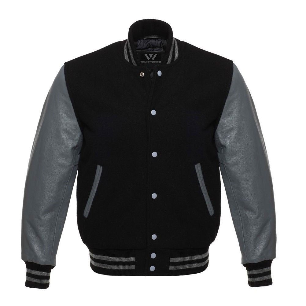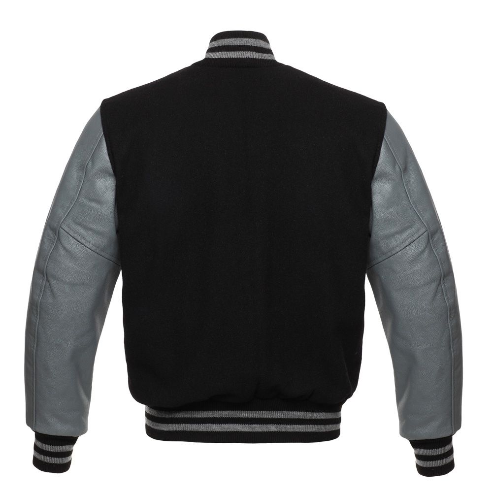 Men's Letterman Varsity Bomber Jacket with Striped Rib & Genuine Leather Sleeves - Black/Gray