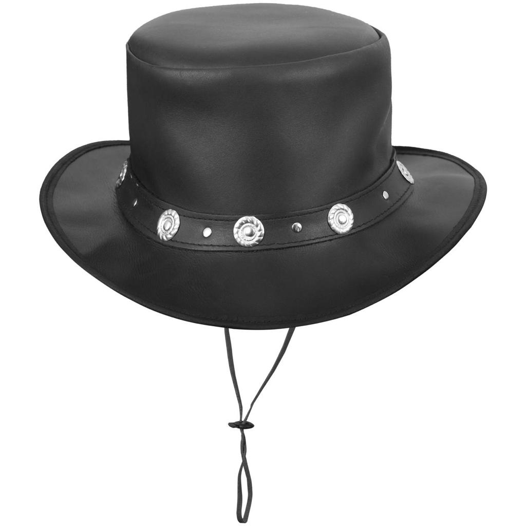 Leather Top Hat has a simple build that allows for the material and blocking to shine. Made out of genuine leather that has been given a slight matte finish, complimented with a leather conchos band with a flat top crown and a shapeable wired brim to allow for customization.