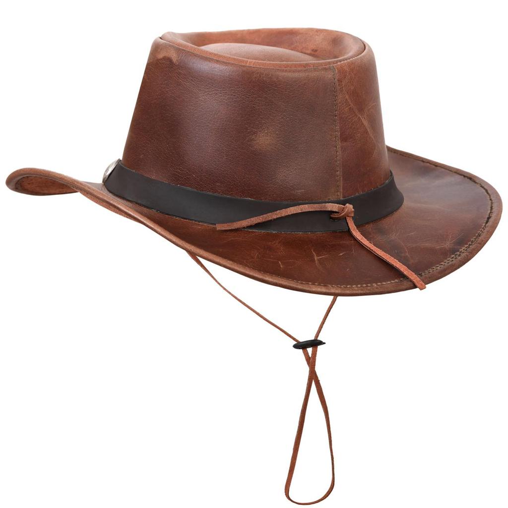 Leather Hat can be crushed but still keeps its shape. Leather treated with waxes and oils to protect it from the elements.