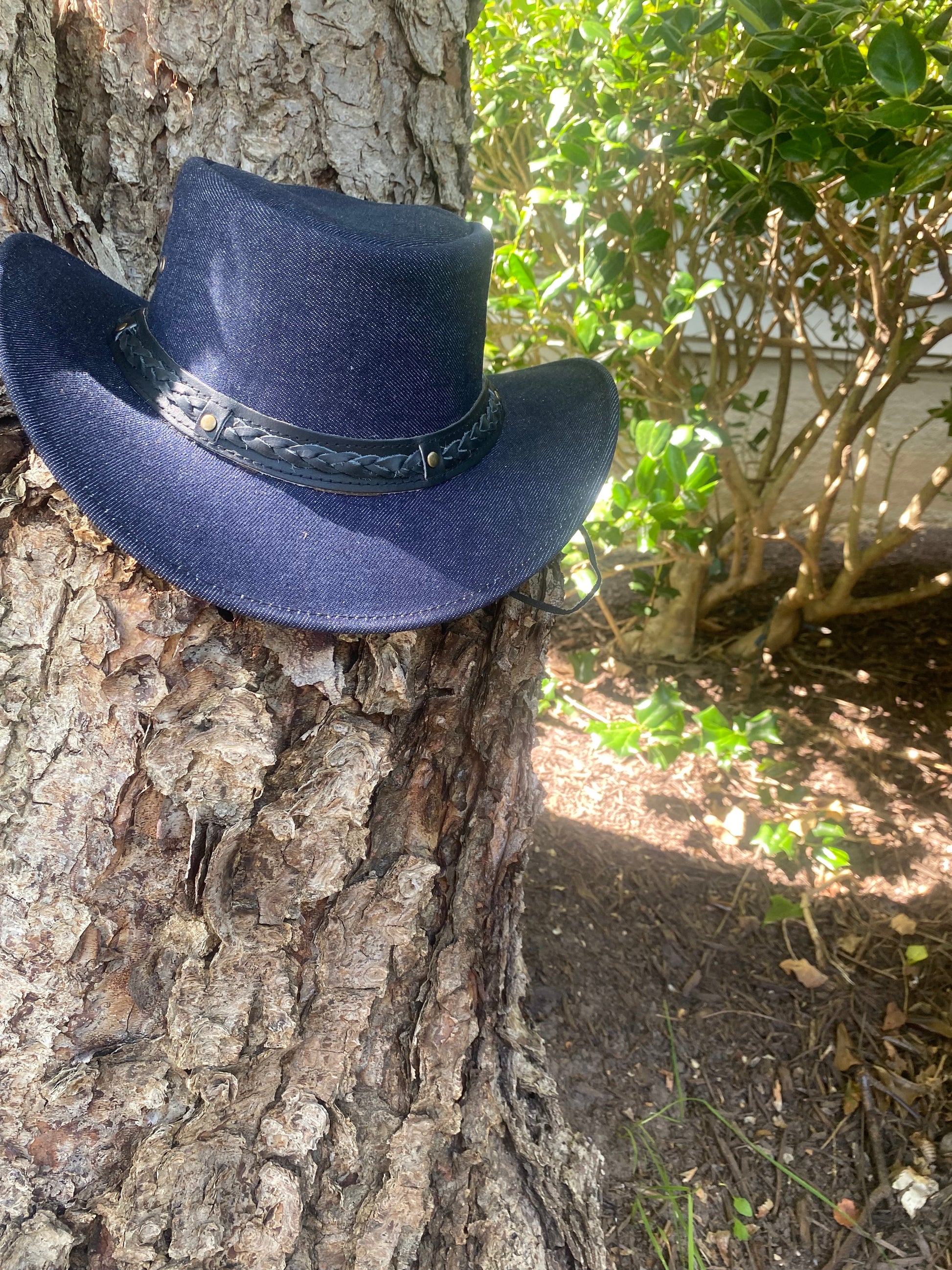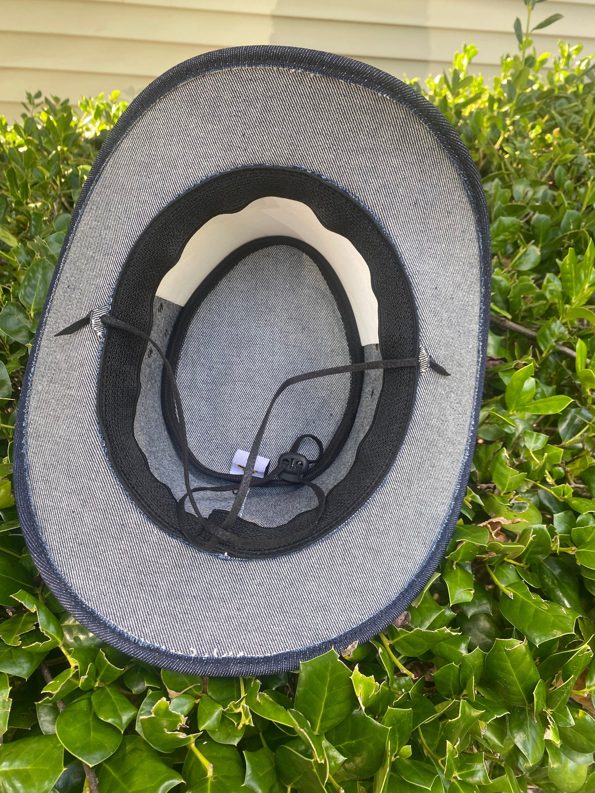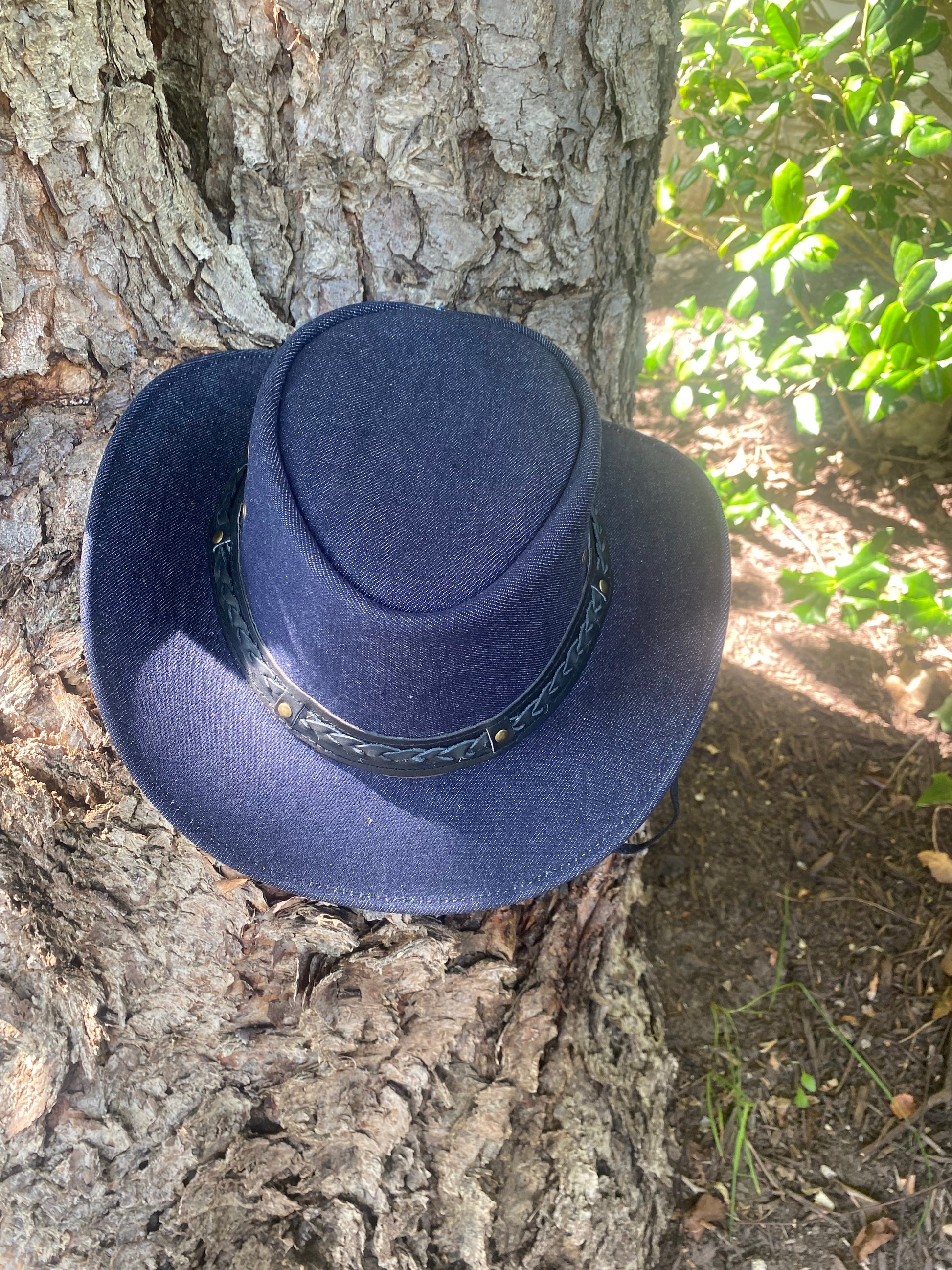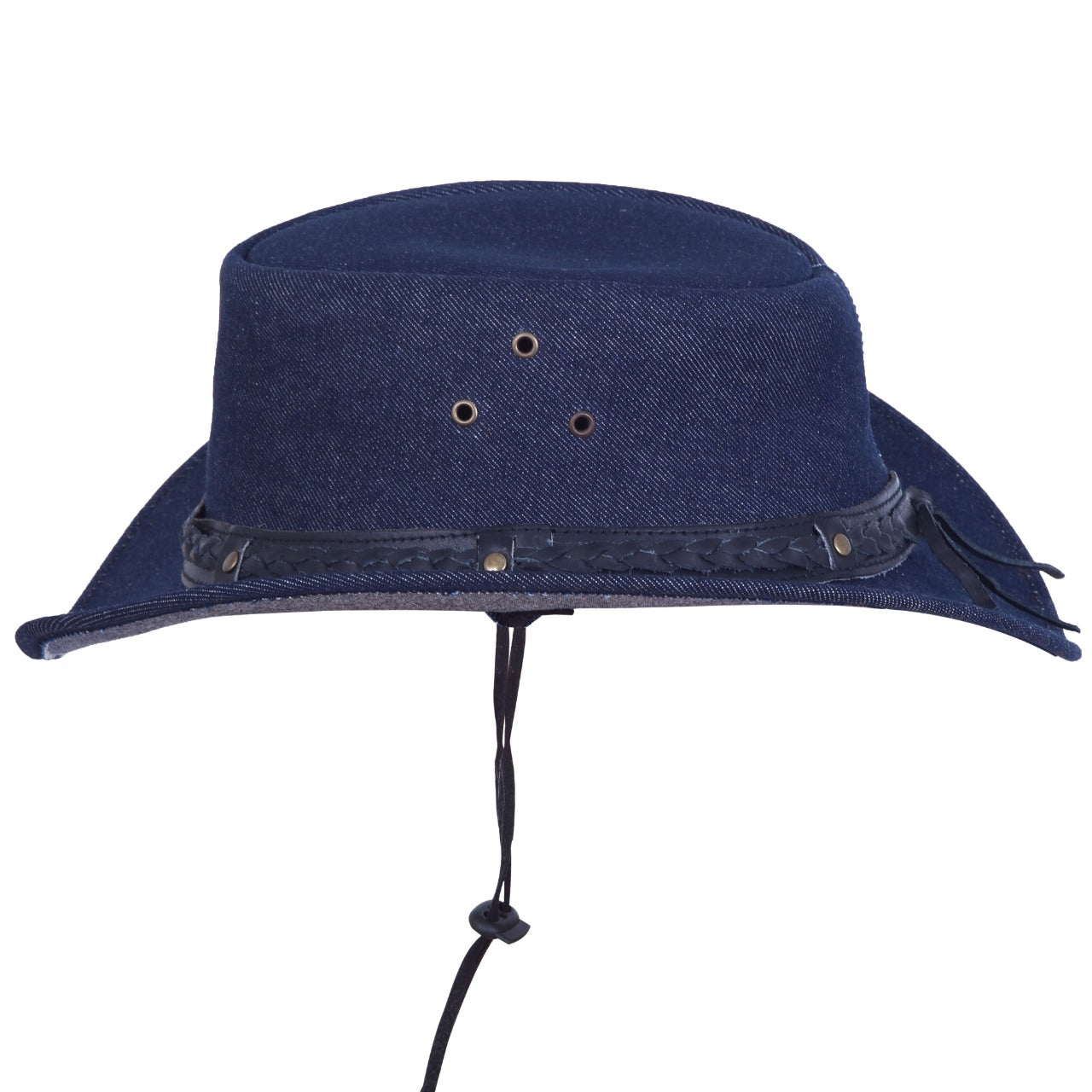 Denim Cowboy Western Hat With Braided Leather Band & Adjustable Chin Strap