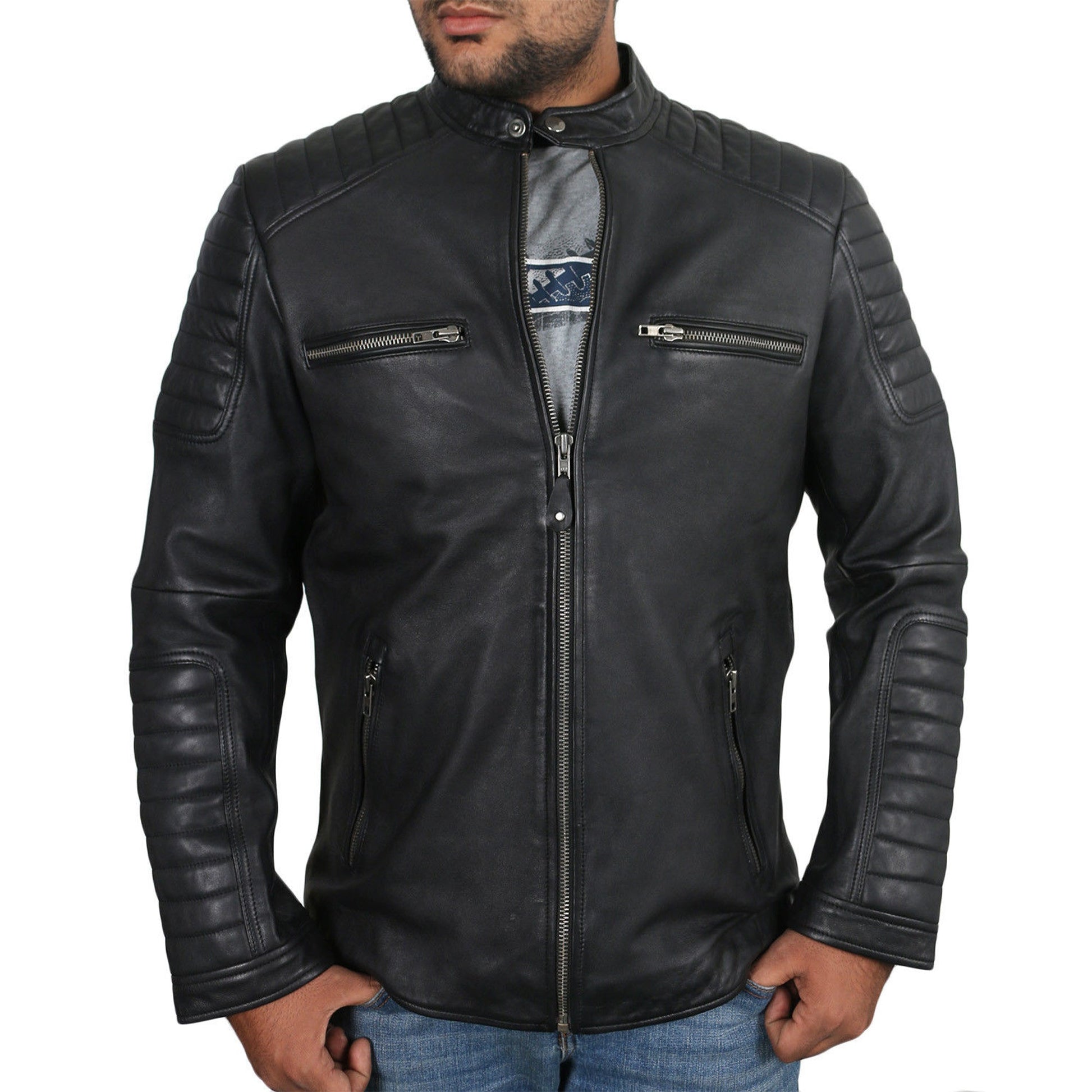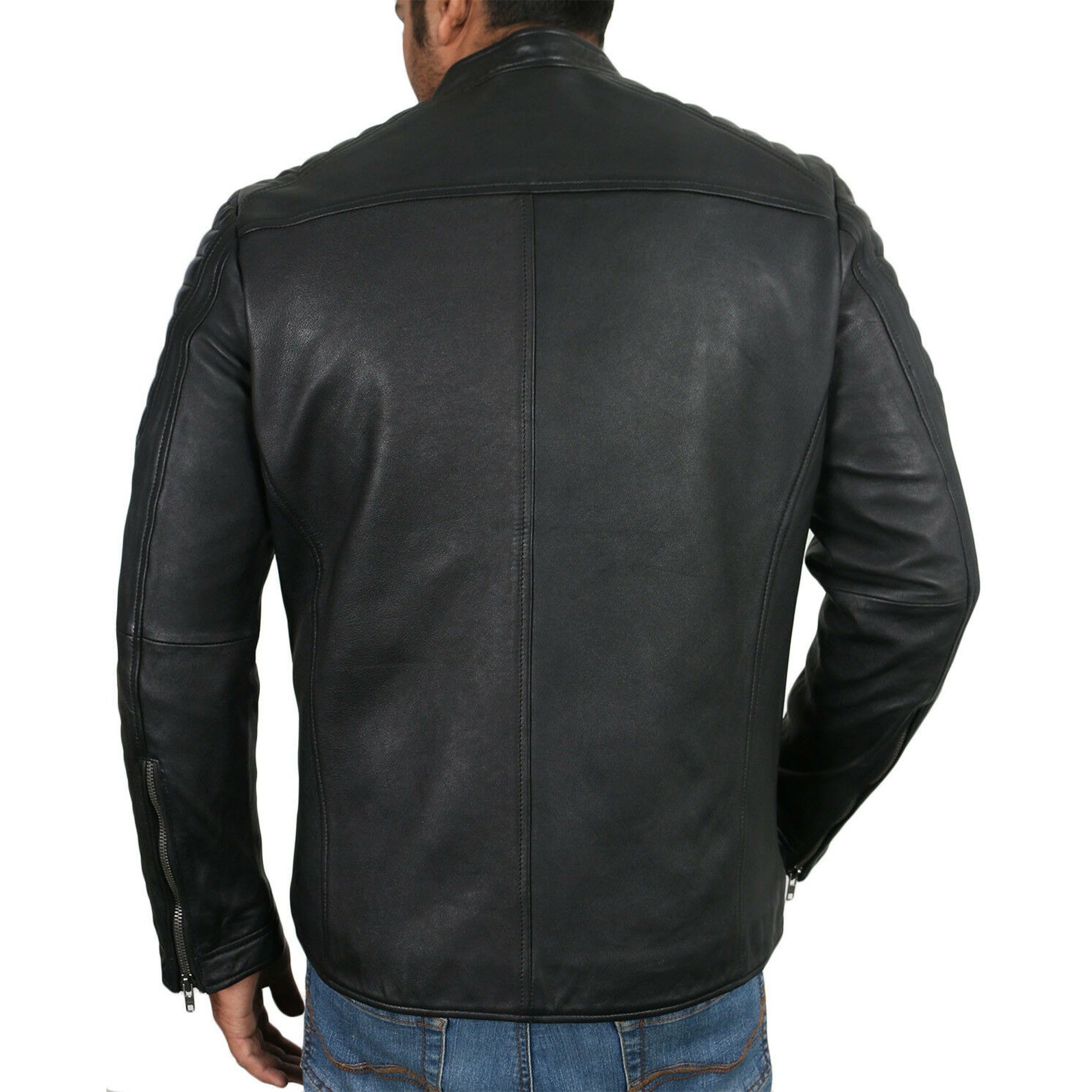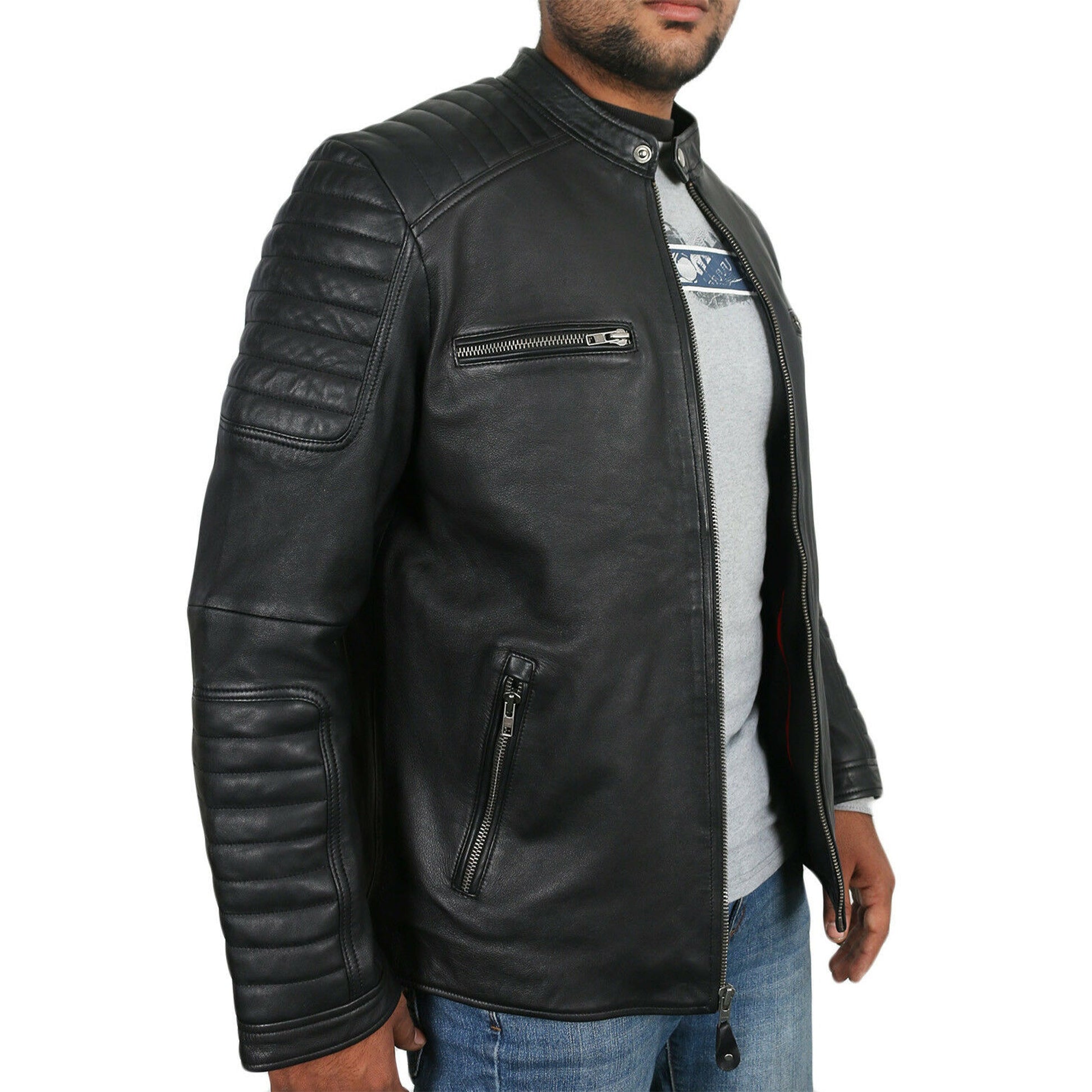 Men's Genuine Leather Moto Jacket with Full Striped Sleeves