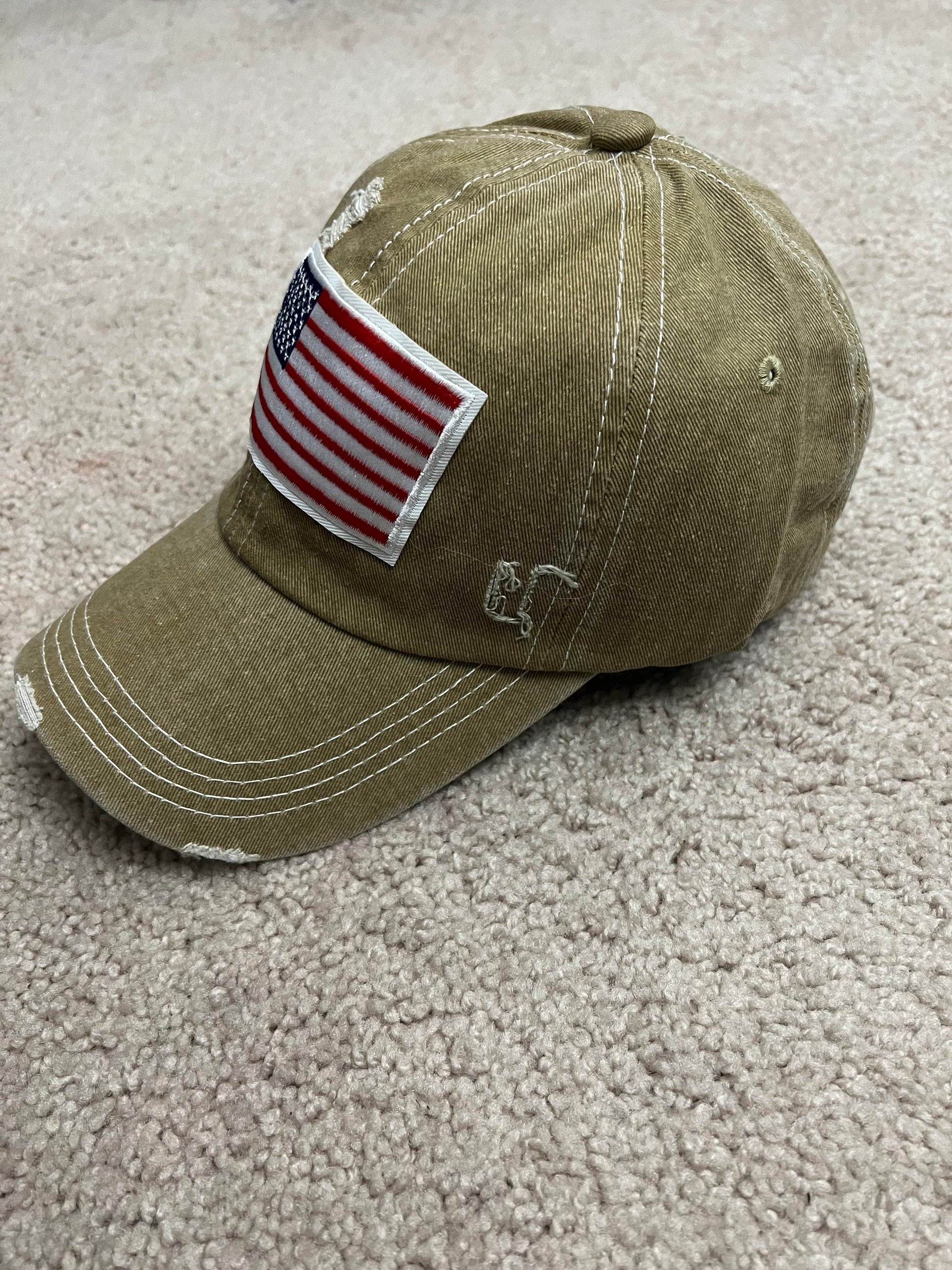 Khaki Distressed Denim Baseball Style Cap American Flag Hat