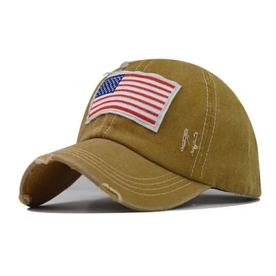 Introducing our American Flag Patch Hat Distressed Denim Baseball Cap in Yellow!