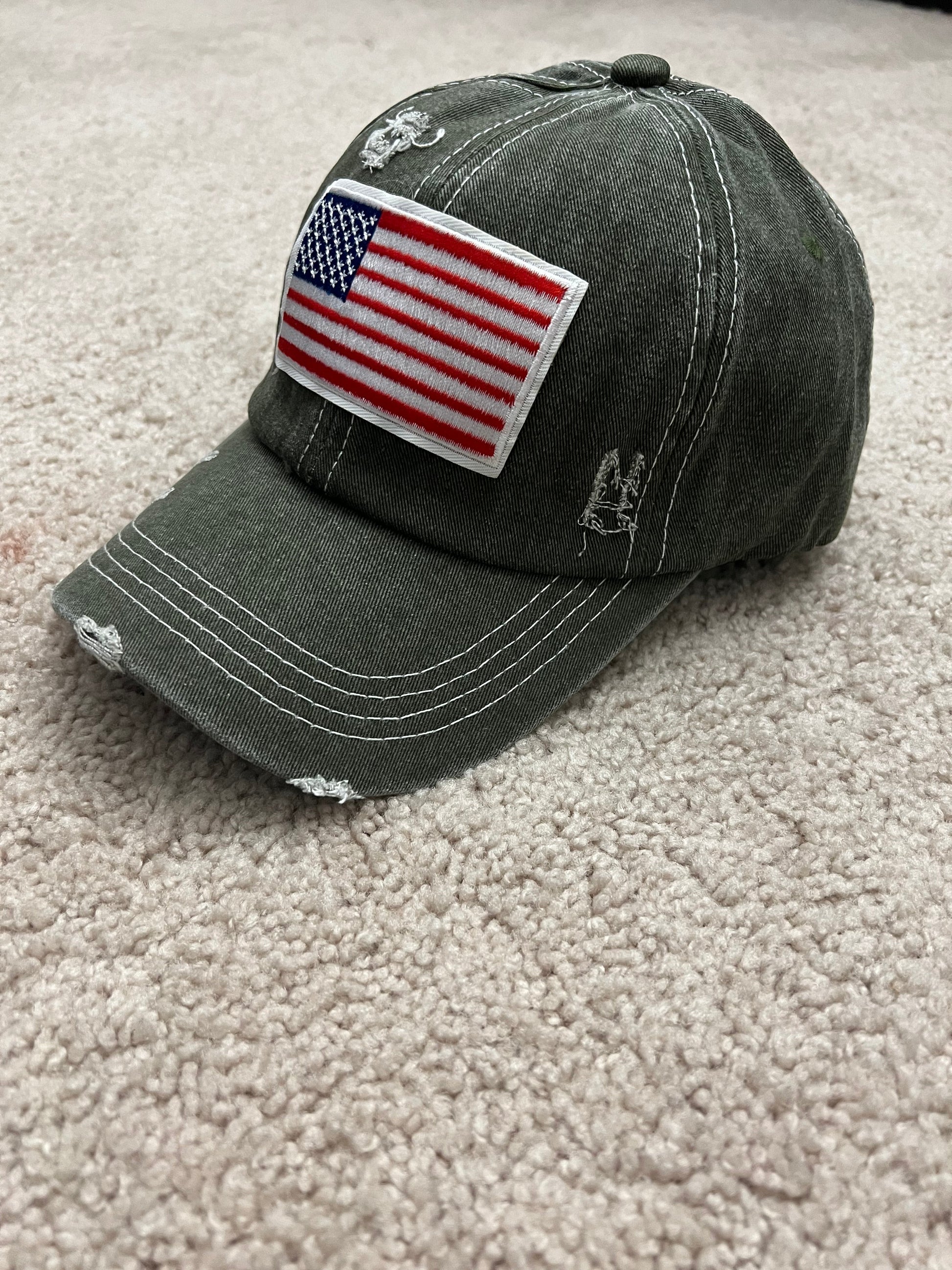 USA Flag Embroidered Distressed Denim Baseball Style Cap - Green